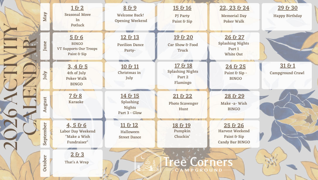Tree Corners Campground has an extensive seasonal waiting list. If you wish to be added to the list, please call or email us your contact information and camper size. As seasonal sites become avaialble, they are offered to current seasonals first. While not impossible, it is unlikily a first year seasonal will get on a water, electric and direct sewer connection site.